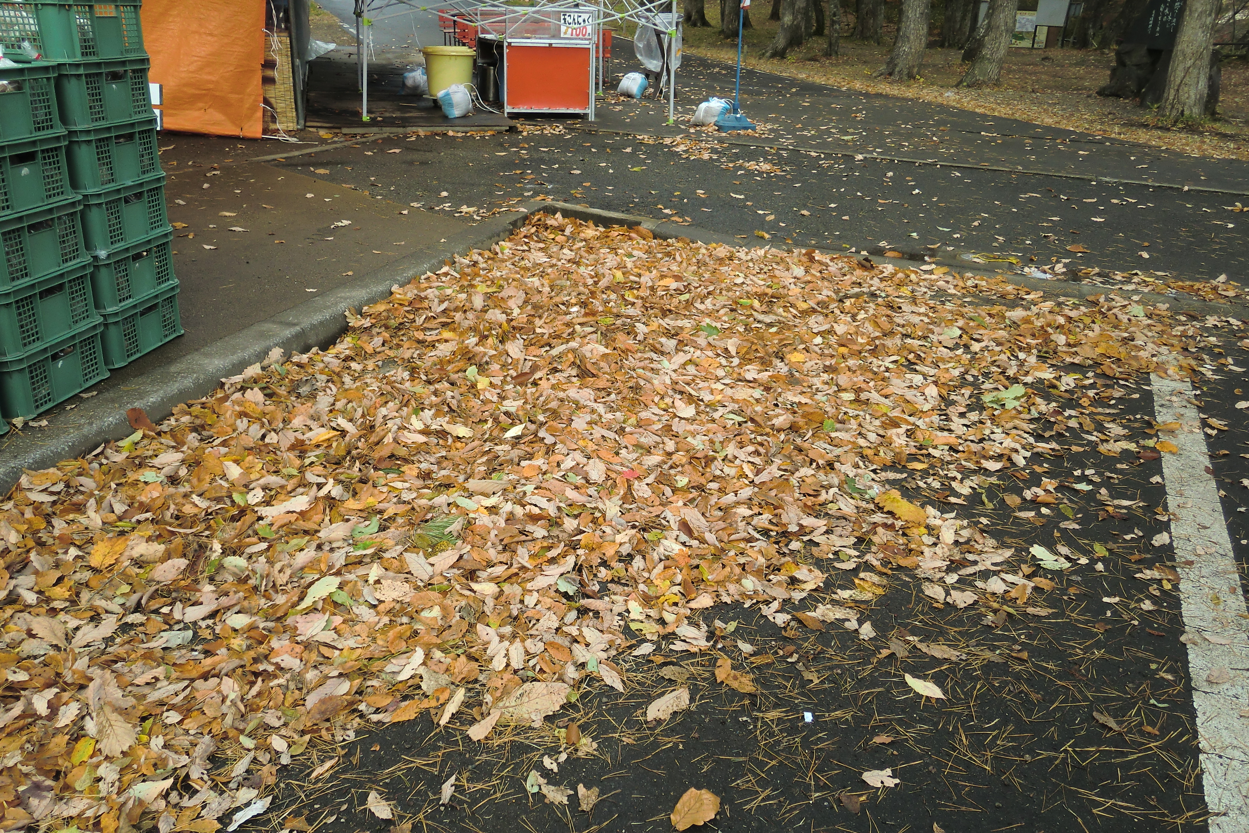 駐車場の隅にはたくさんの葉っぱが落ちていました